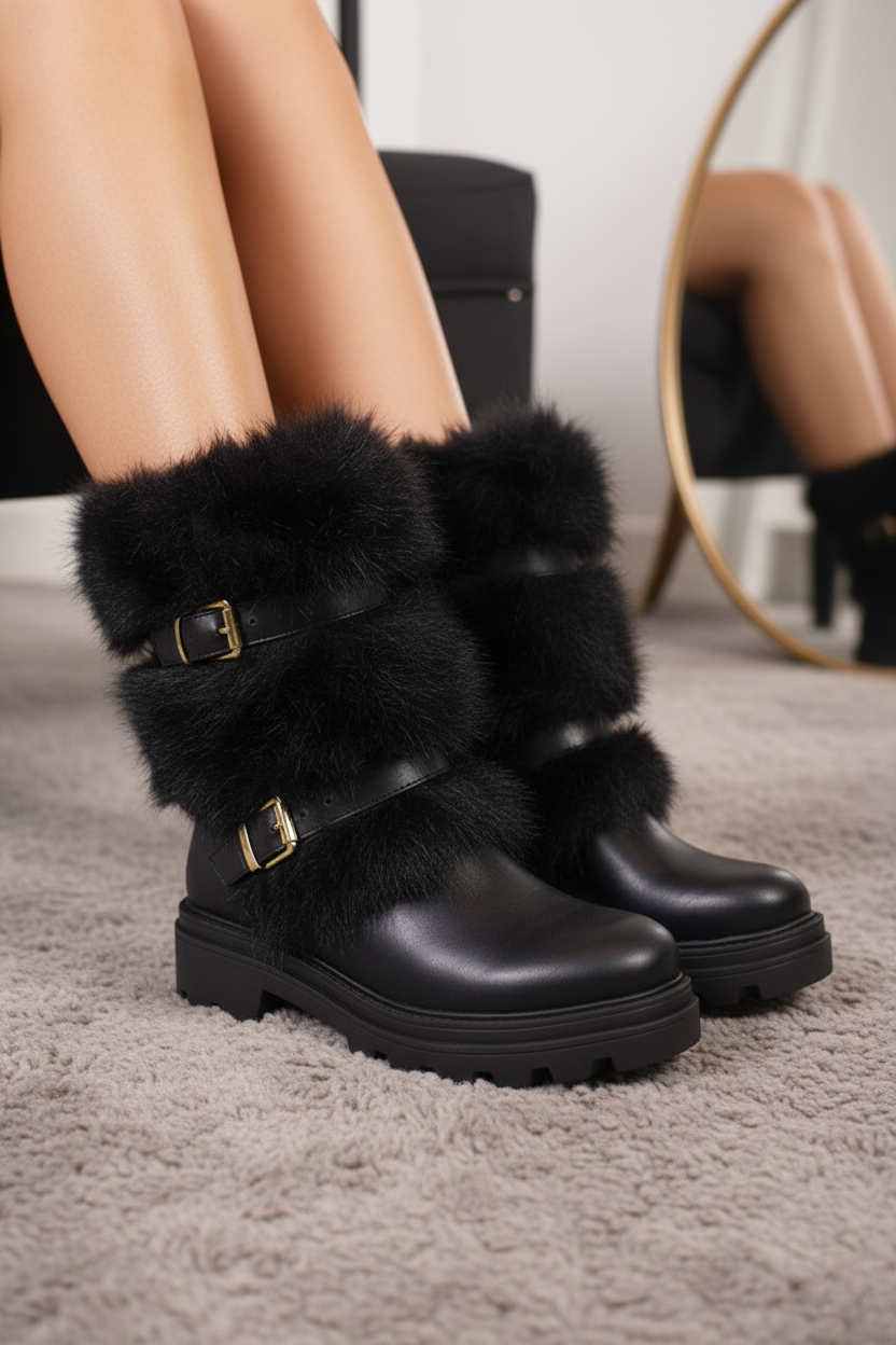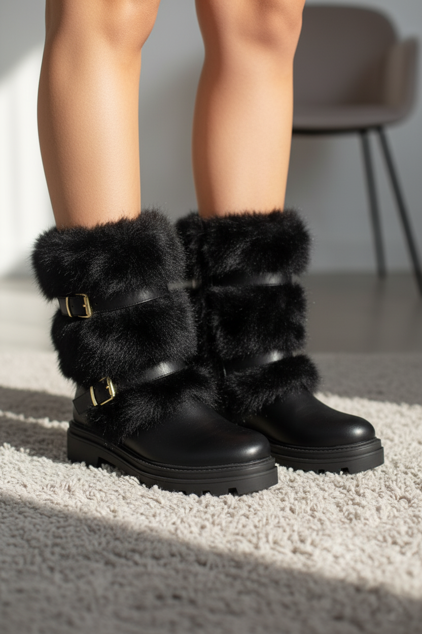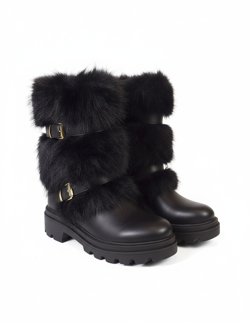 Botas KRISTIAN-1 | BLACK de moda con acabado en piel sintética y detalles de peluche negro en la caña. Cuentan con dos hebillas decorativas doradas y suela tipo track para mejor agarre y estilo invernal. Perfectas para outfits elegantes o casuales.