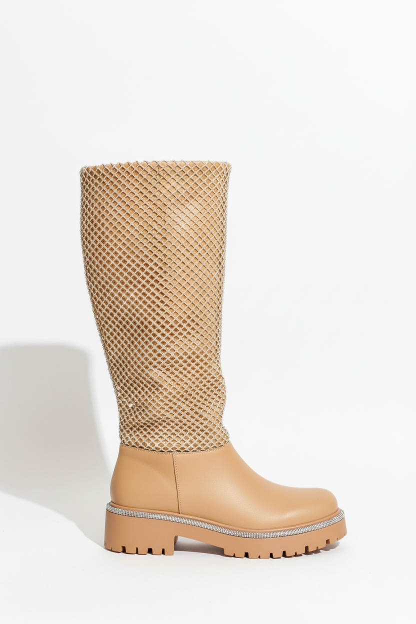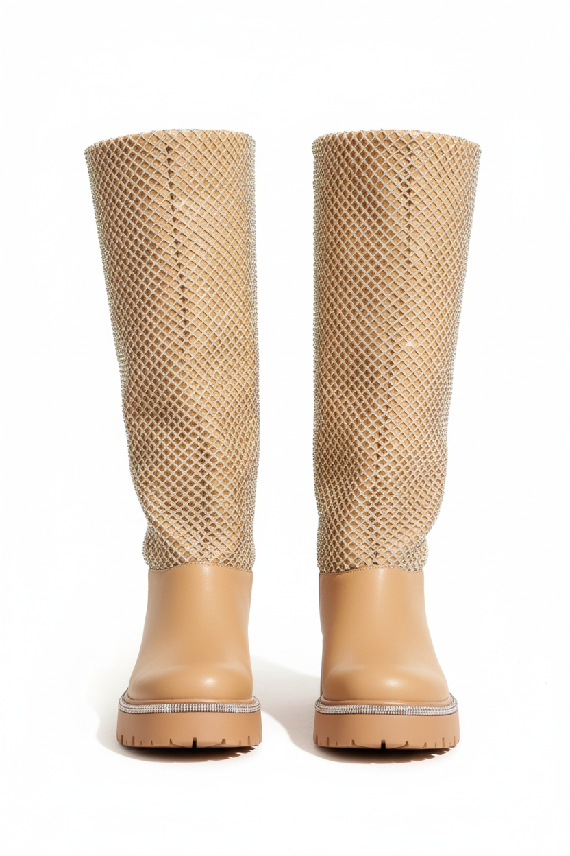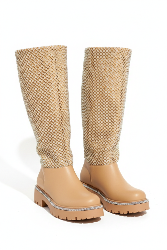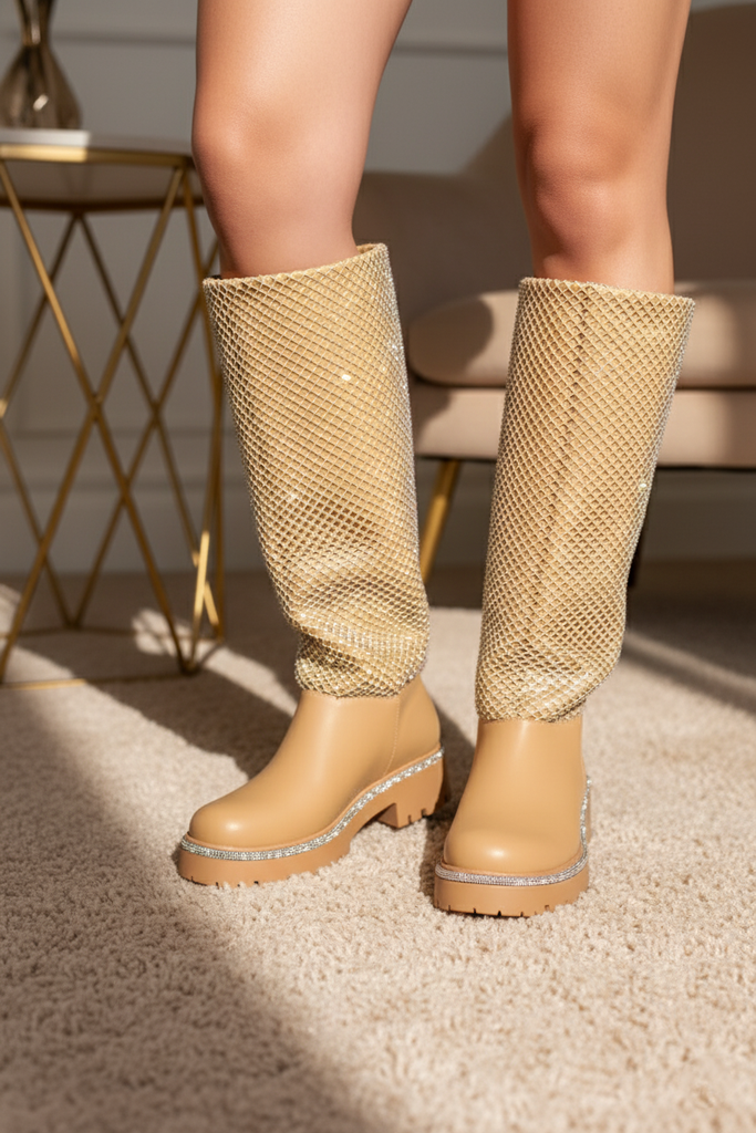 Botas altas UNIYA | NUDE con caña cubierta de malla dorada con brillo. Su diseño combina un estilo elegante y moderno con una suela chunky y detalles de pedrería en el borde, perfectas para elevar cualquier look casual o de noche.