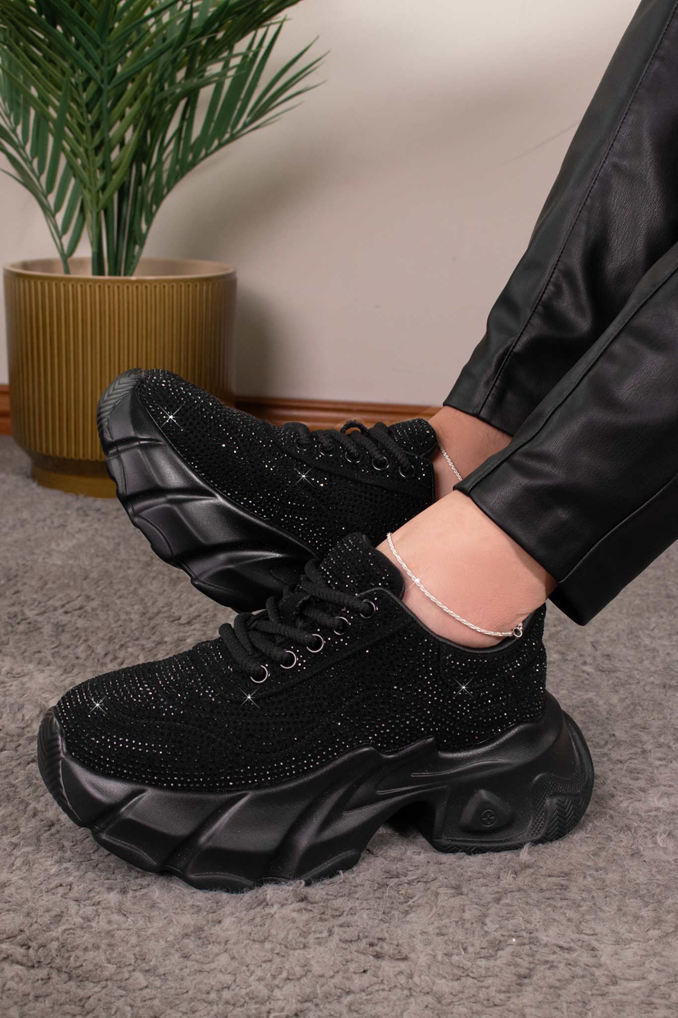 Tenis SOPHIA | BLACK de plataforma en color negro con tejido brillante y detalles de pedrería que aportan un toque glamuroso. Su suela gruesa y diseño moderno ofrecen altura y comodidad, perfectos para destacar en cualquier look casual o nocturno.