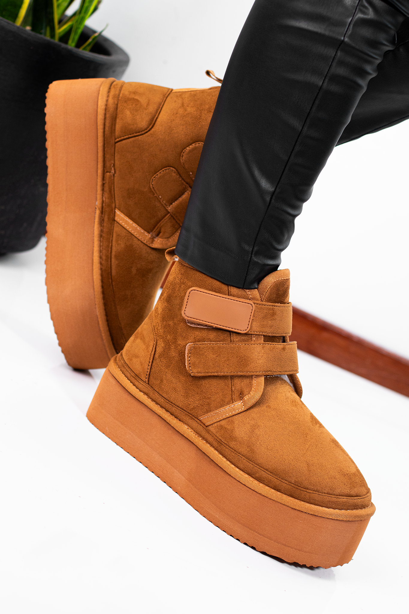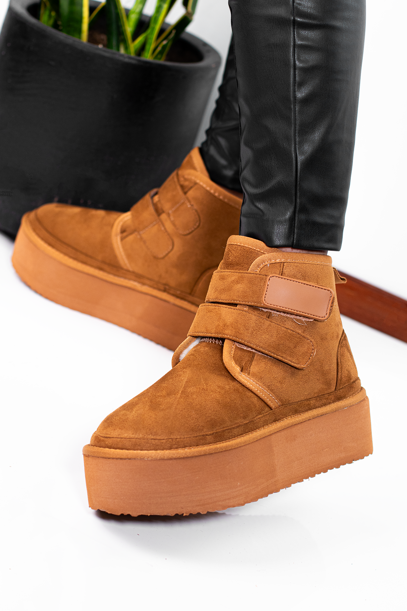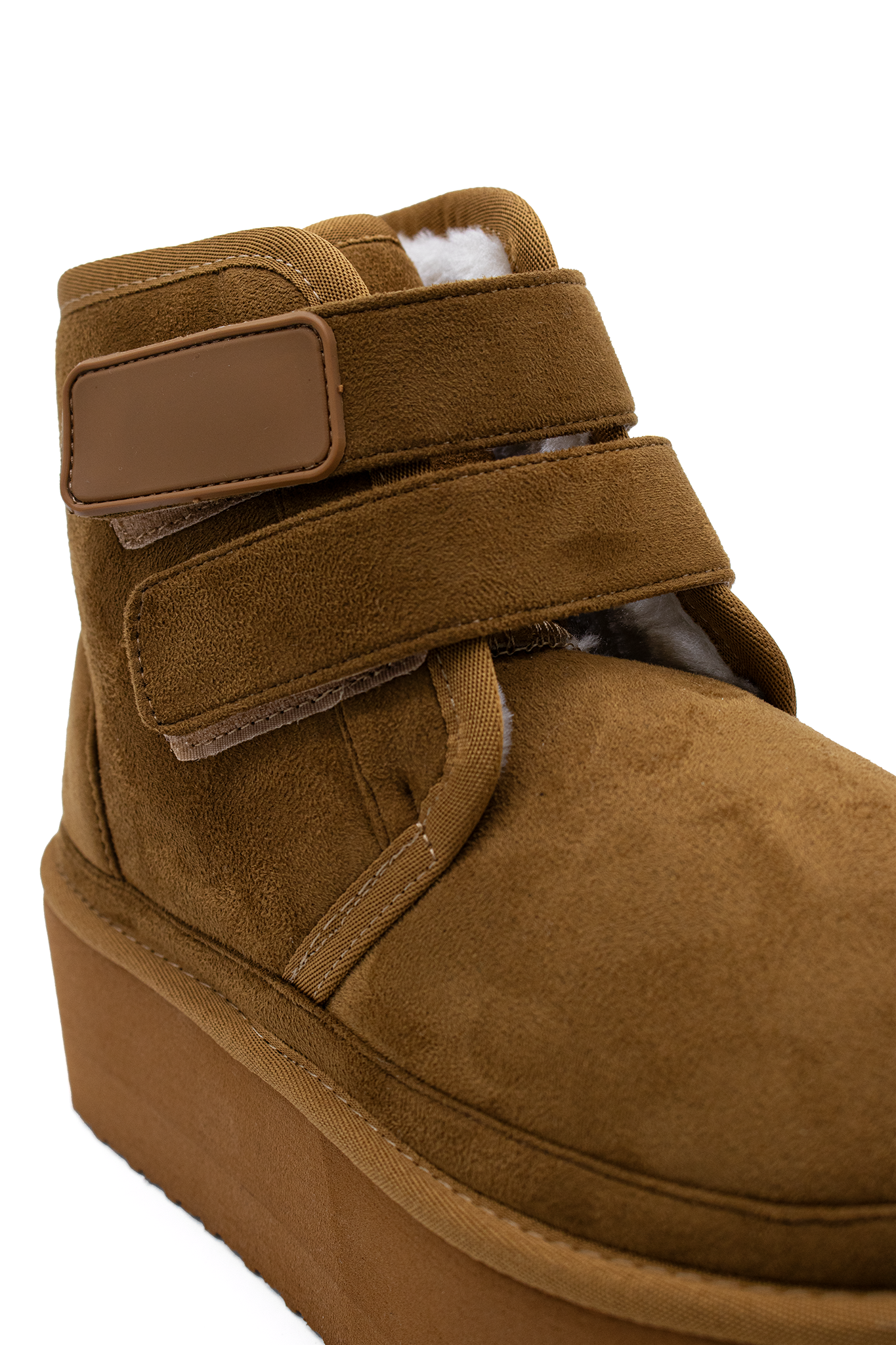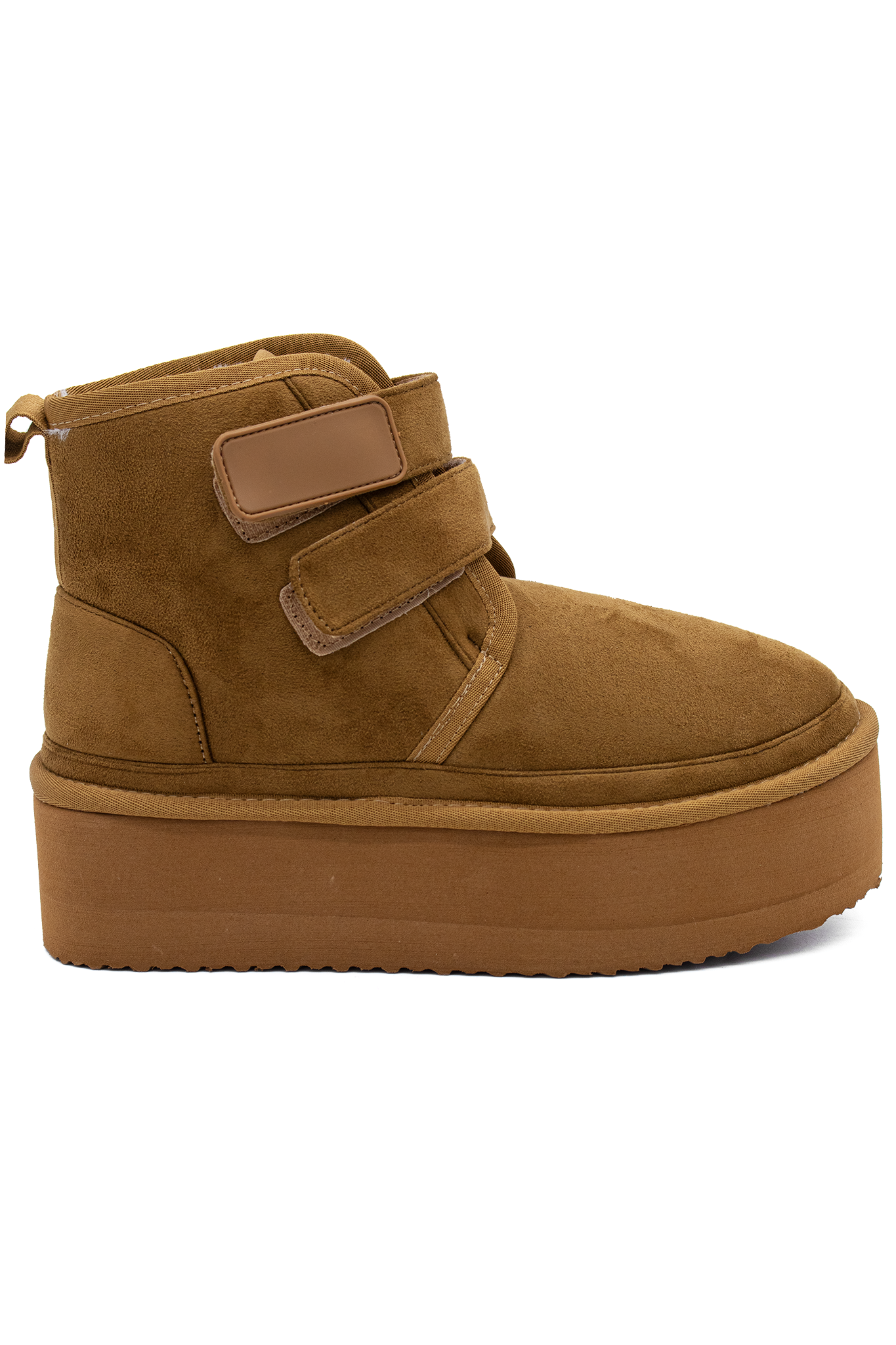 Botines FELIA | CAMEL de gamuza sintética en tono camel con plataforma gruesa y doble cierre de velcro. Su diseño moderno combina comodidad y estilo urbano, ideales para un look casual con un toque elevado..