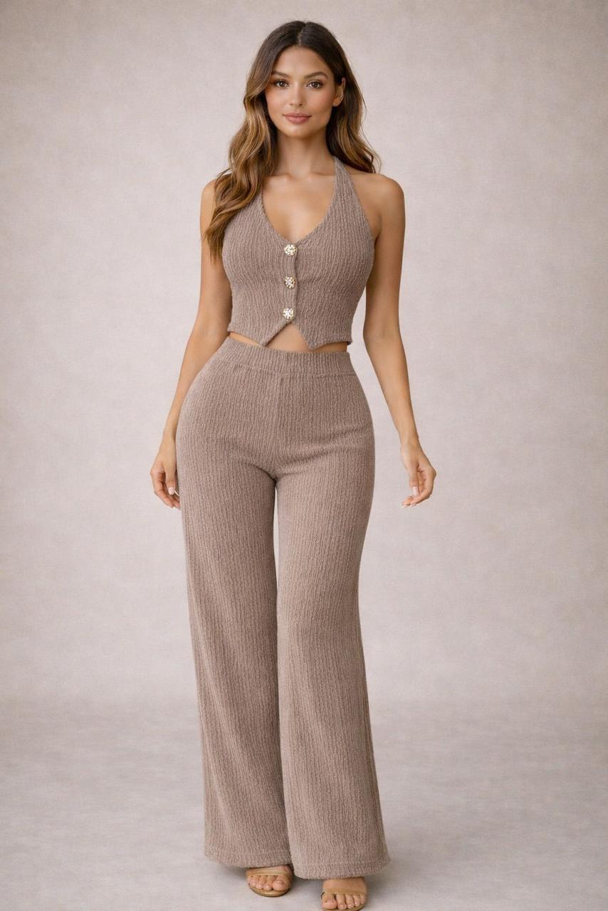 Conjunto SET MADISON | TAUPE tejido de dos piezas en tono taupe, un color neutro y sofisticado que refleja elegancia y modernidad. El top tipo halter con escote en “V” estiliza la figura y presenta botones decorativos al frente que aportan un detalle delicado y femenino. El pantalón de tiro alto y corte recto ofrece una silueta alargada y favorecedora, confeccionado en una tela suave con ligera textura que brinda comodidad durante todo el día.