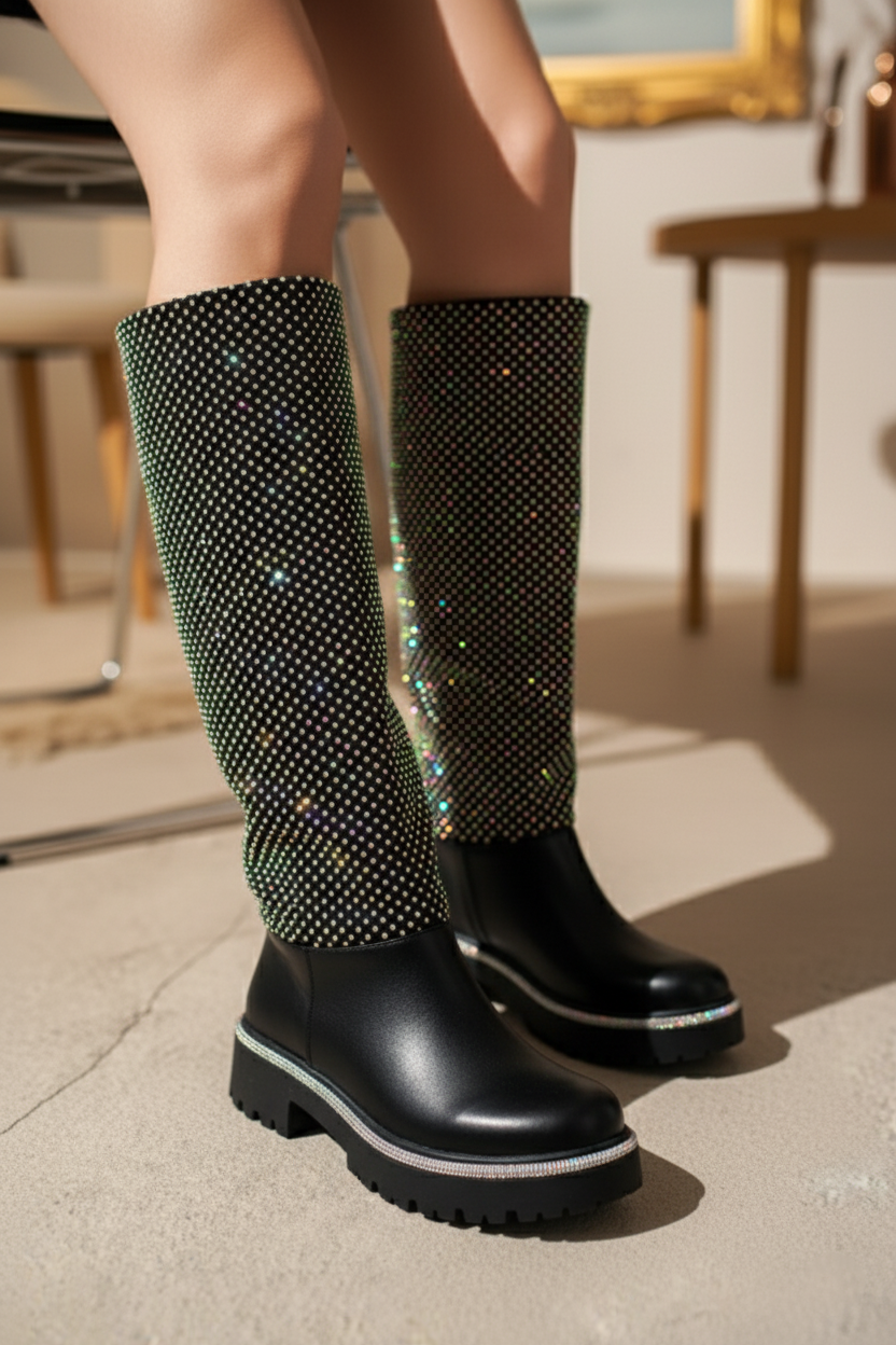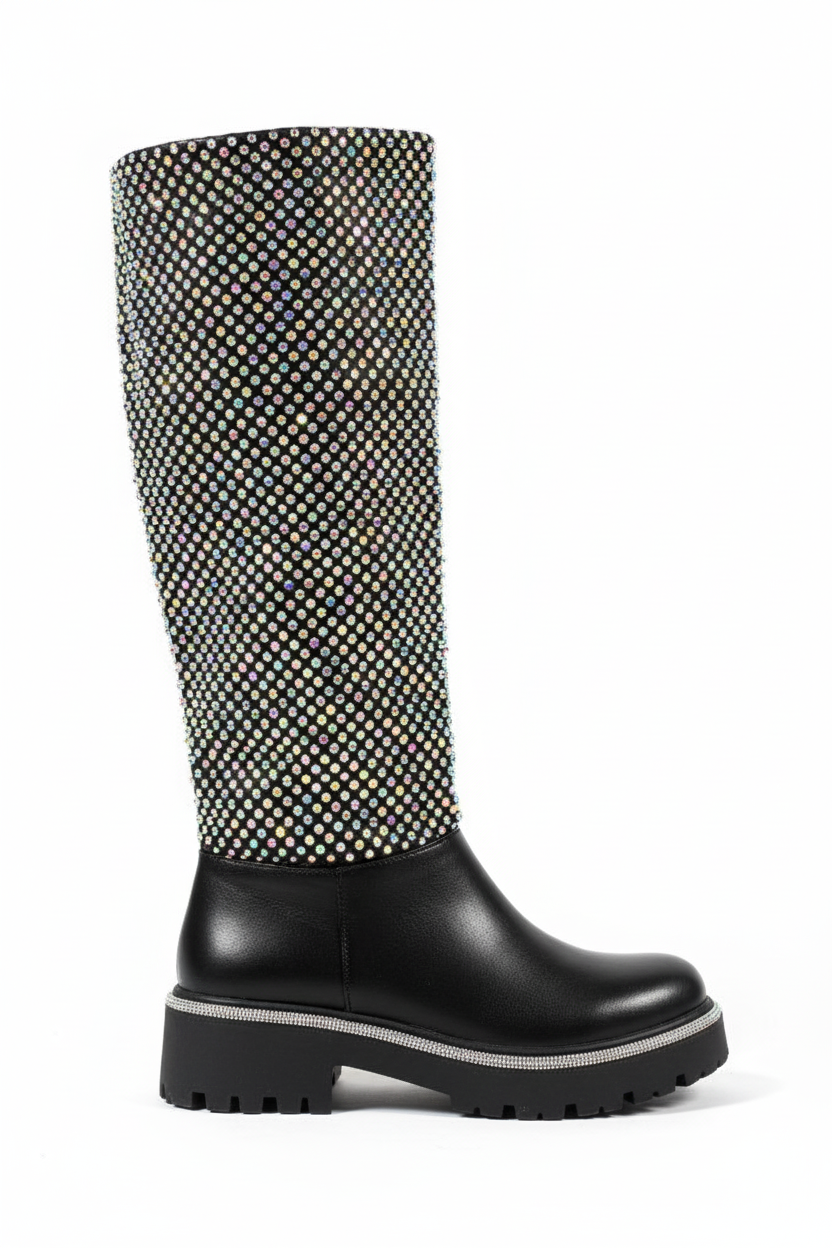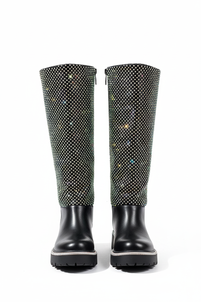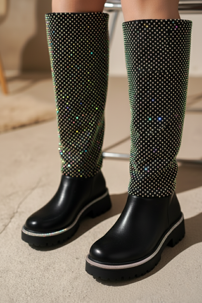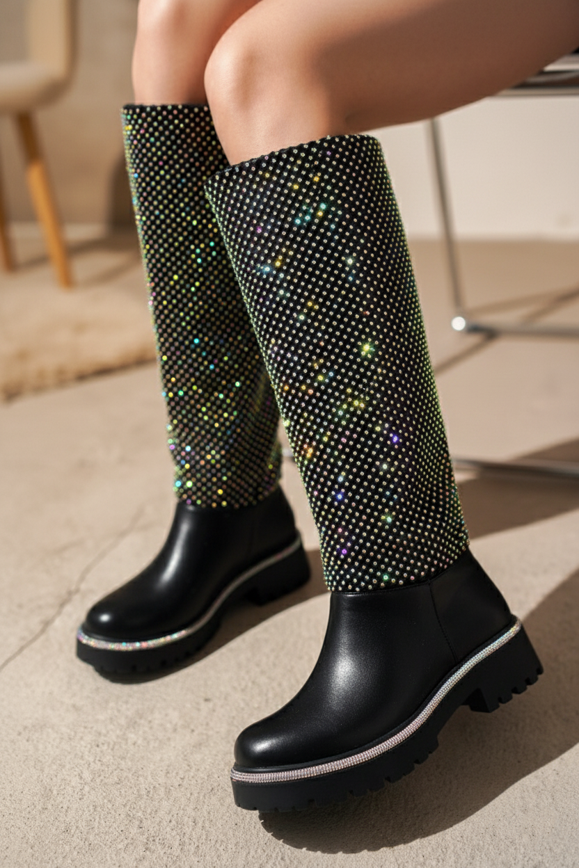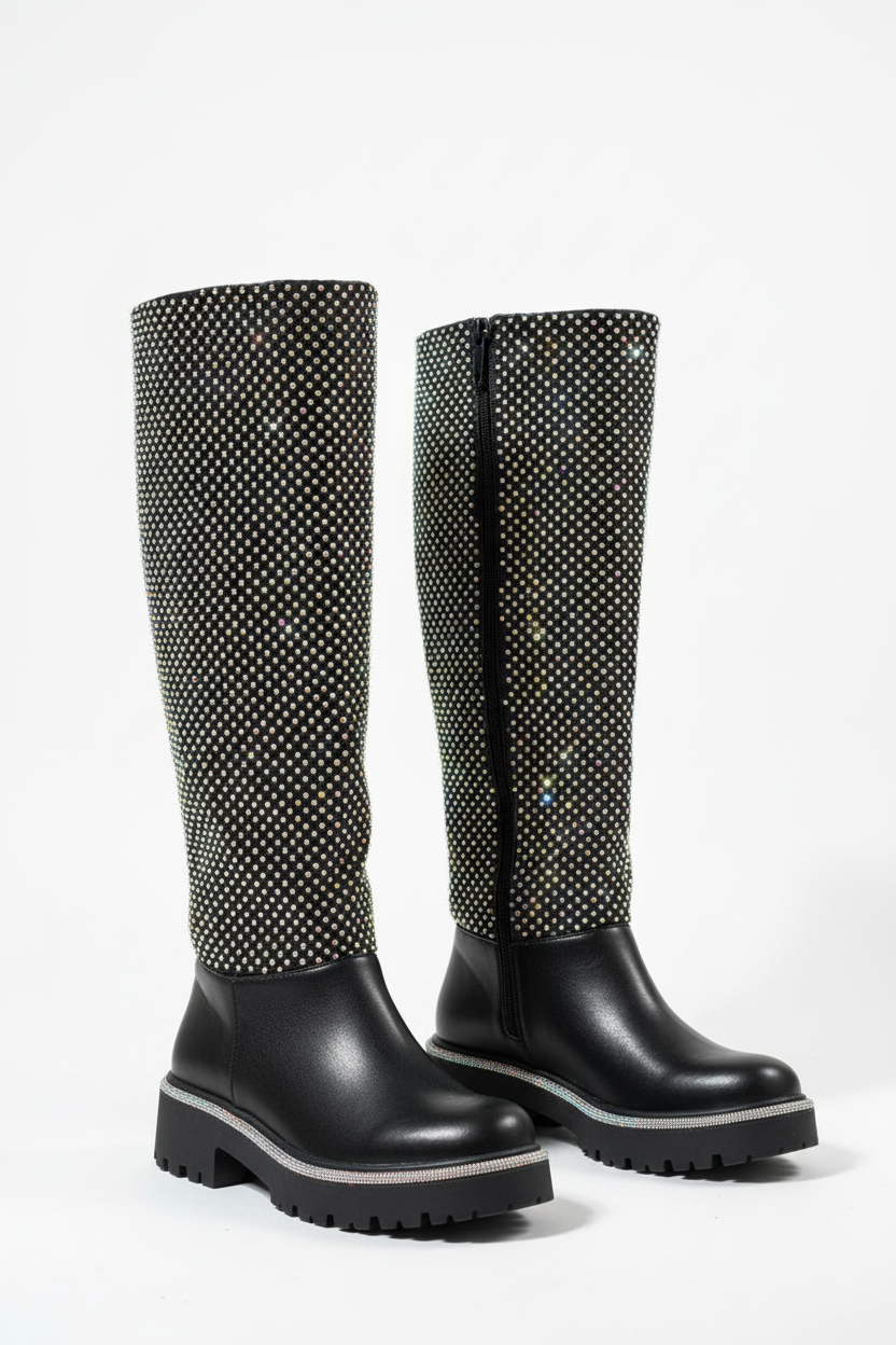 Botas altas UNIYA | BLACK con caña recubierta de cristales brillantes tipo diamante. Su suela chunky con plataforma baja y detalles de pedrería aporta un estilo glamuroso y moderno, perfecto para destacar sin sacrificar comodidad.