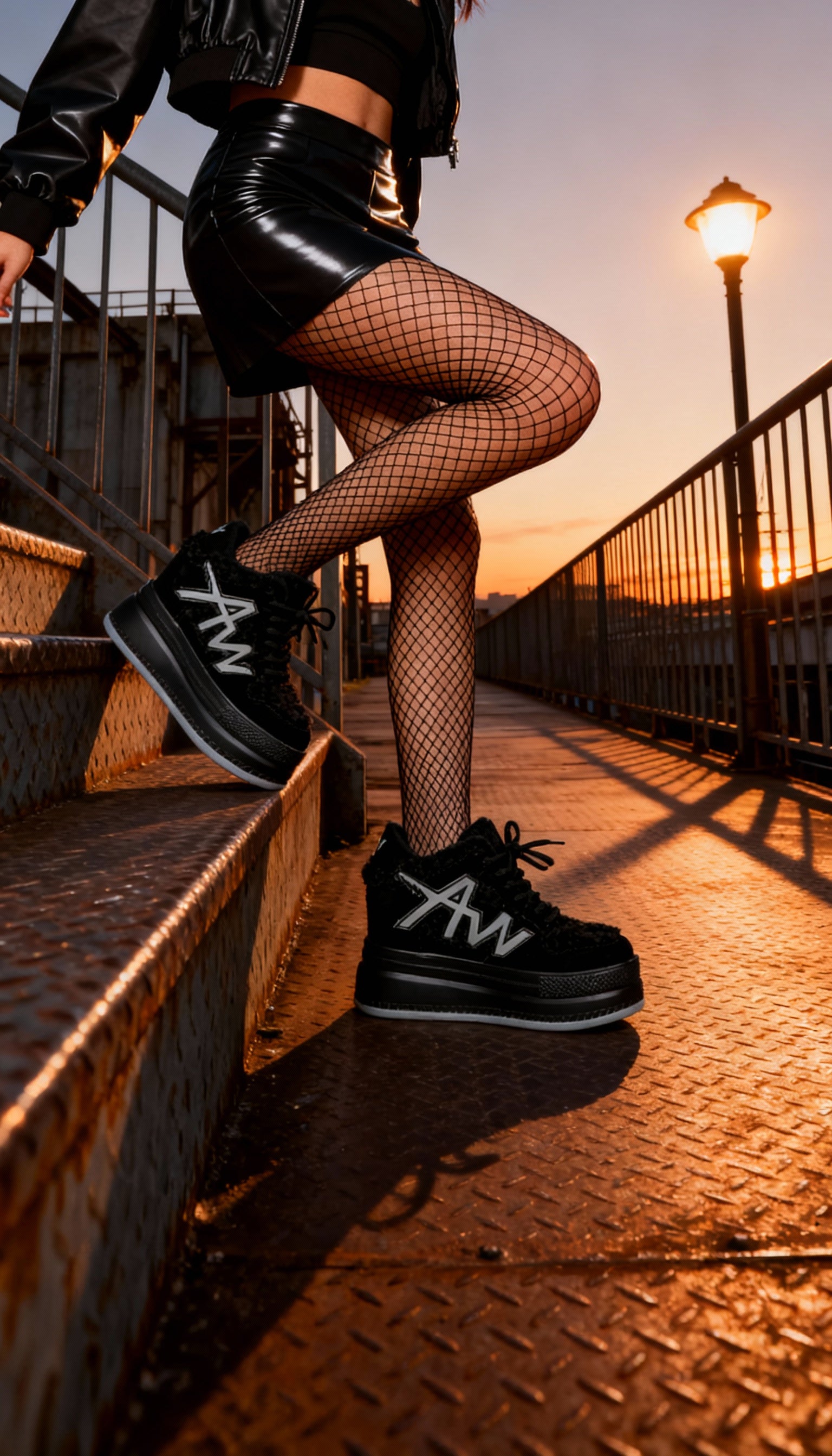 Los tenis QUINCE-01 | BLACK de plataforma negra con detalles en gris y el logo "AW" es ideal para quienes buscan un calzado cómodo y con estilo. Su diseño moderno y su suela gruesa proporcionan soporte y altura adicional, perfecto para un look casual y urbano.