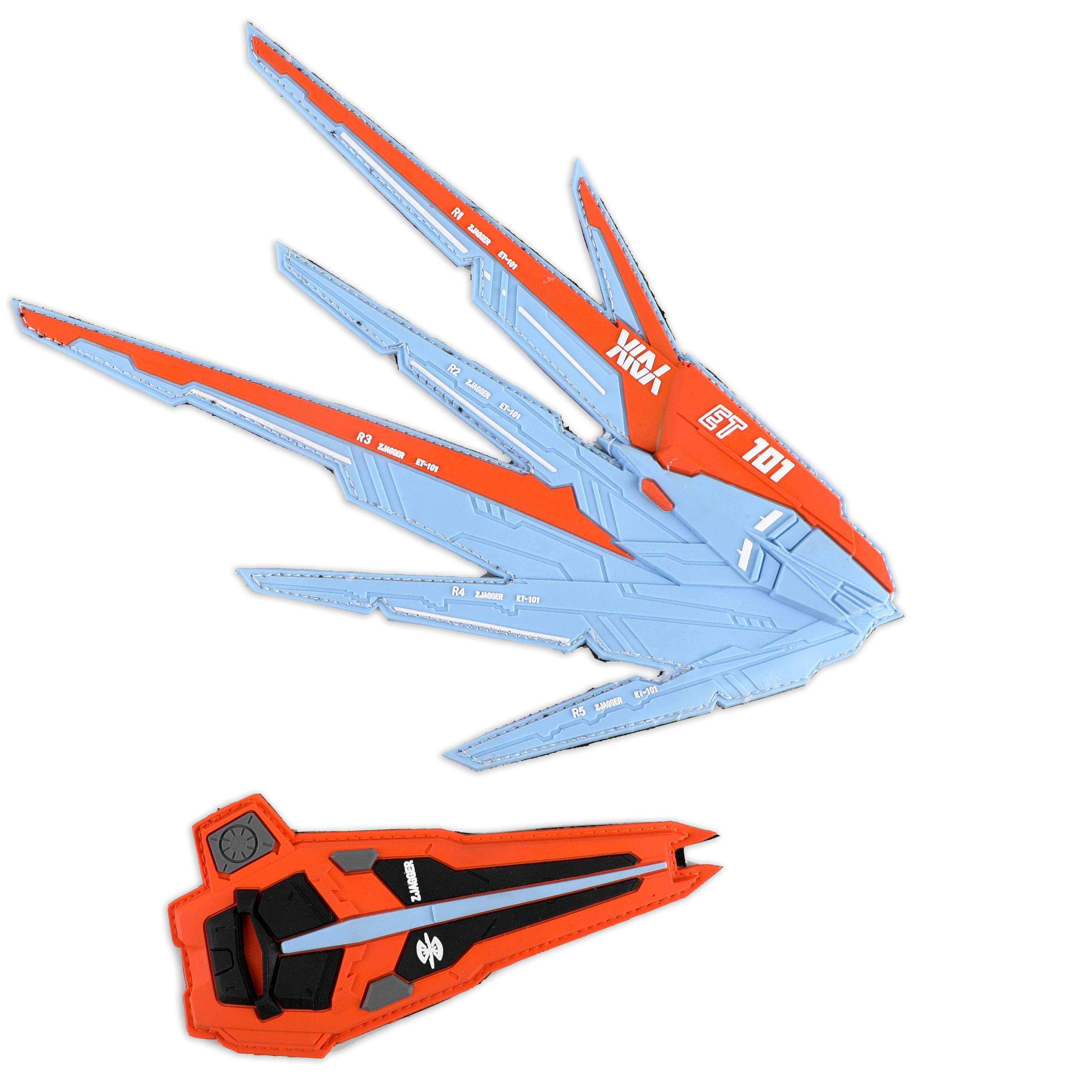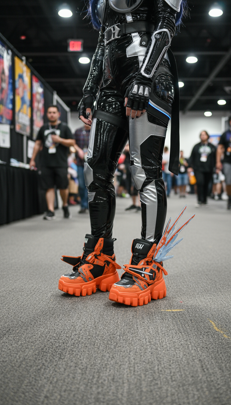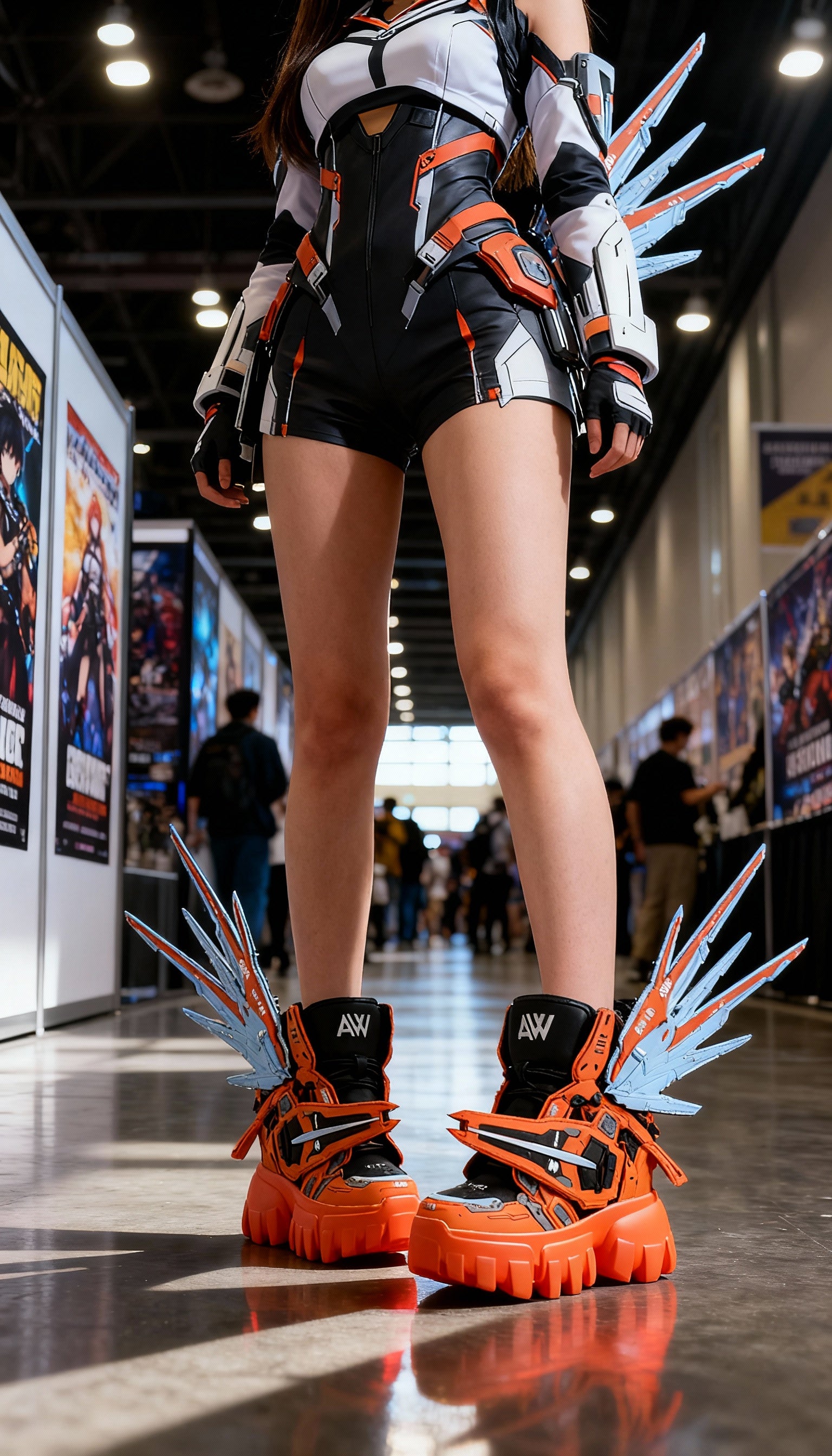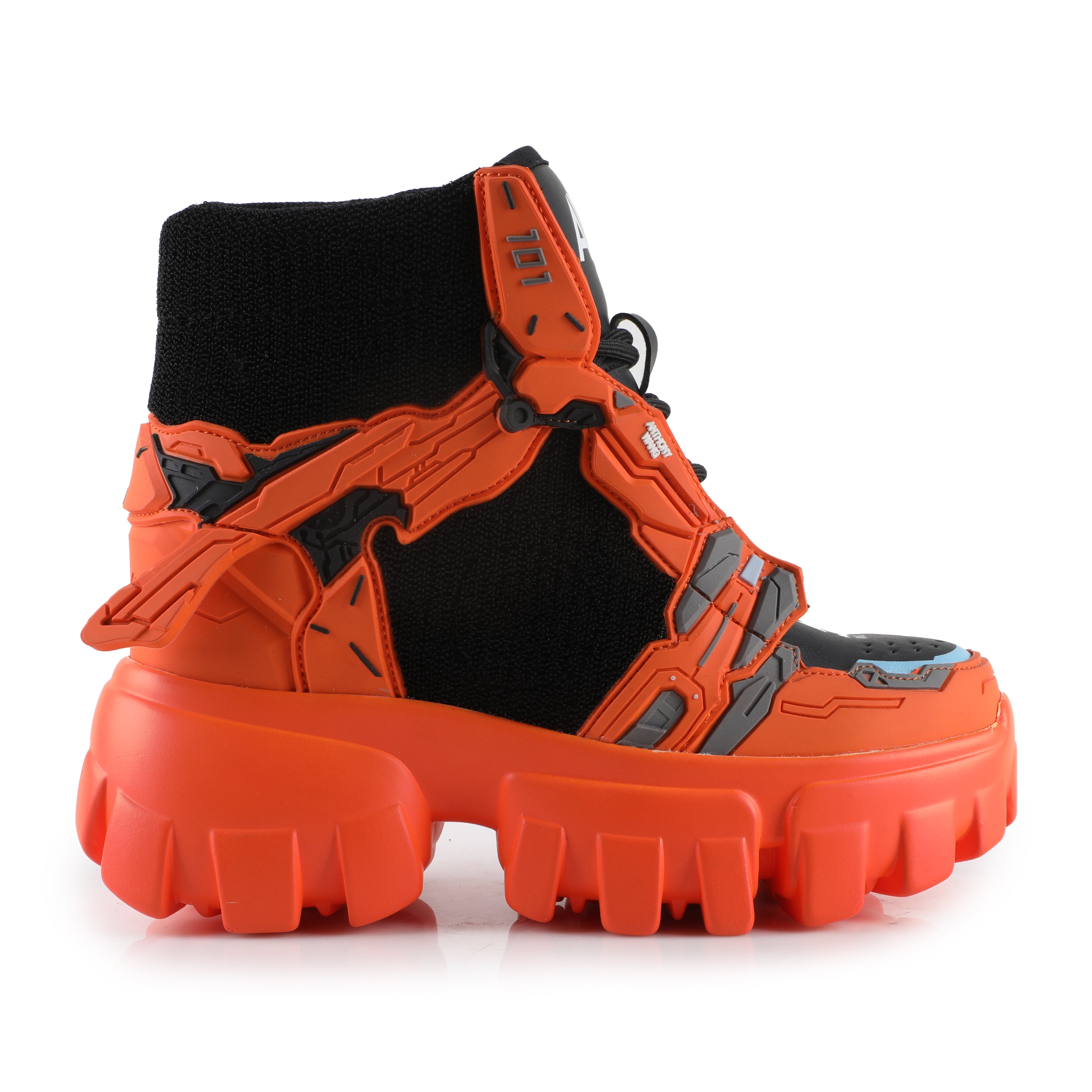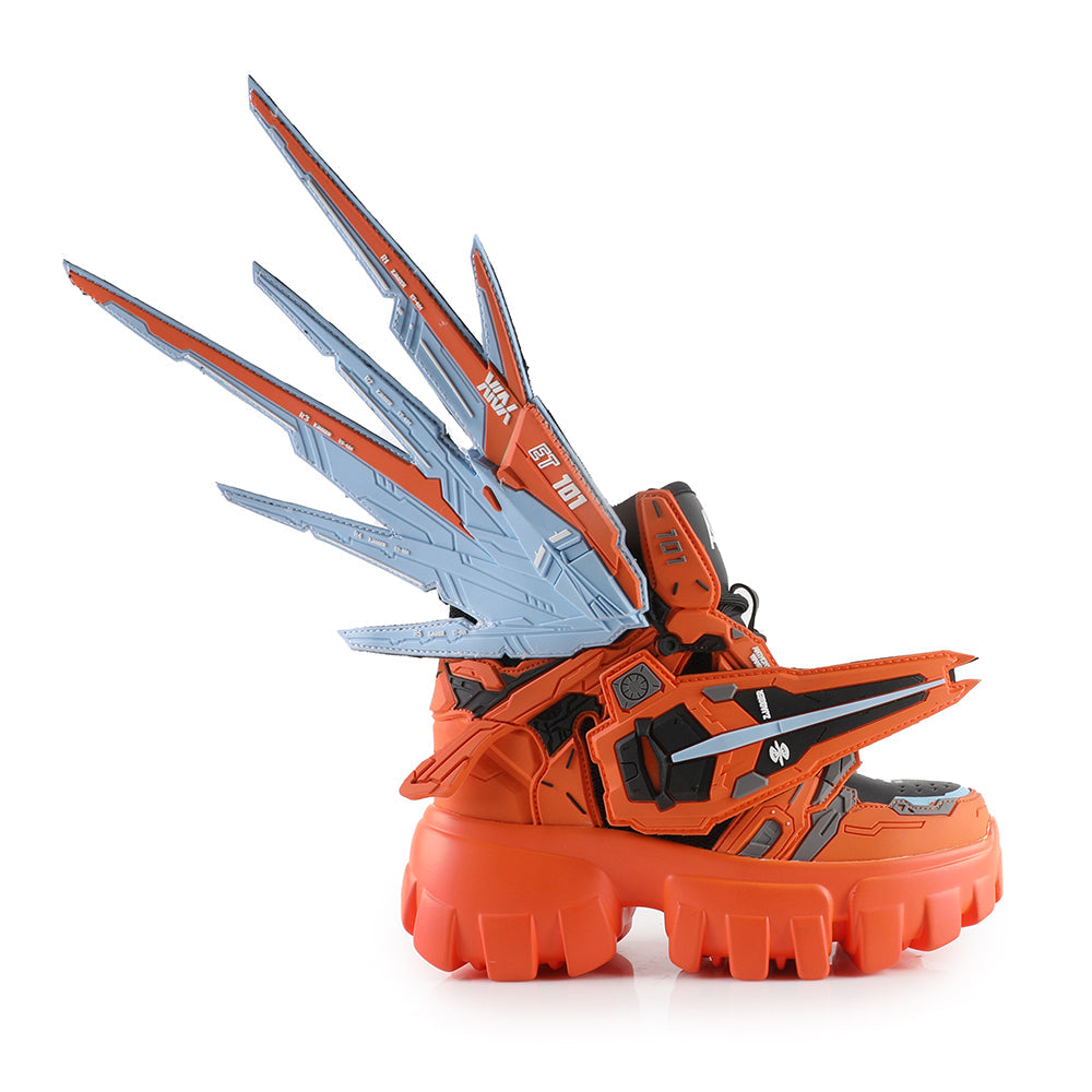Tenis S 04 | Orange futuristas color naranja con plataforma chunky y accesorios desmontables en forma de alas y escudos, estilo exclusivo y llamativo.