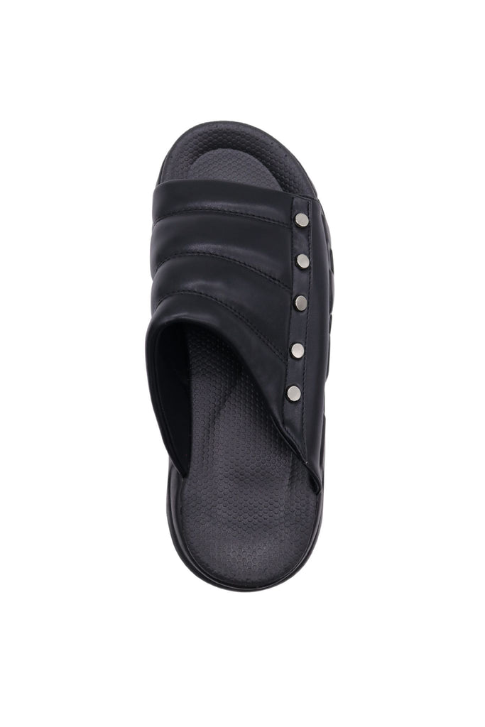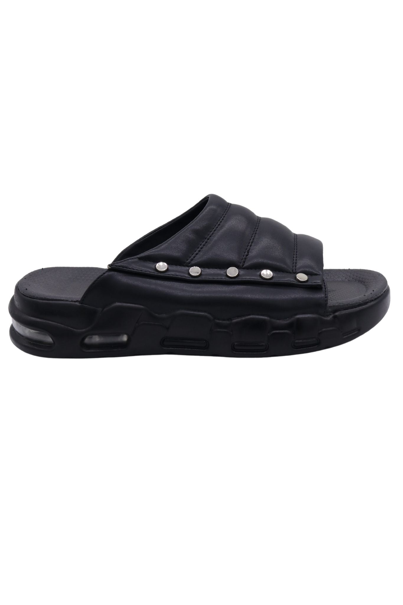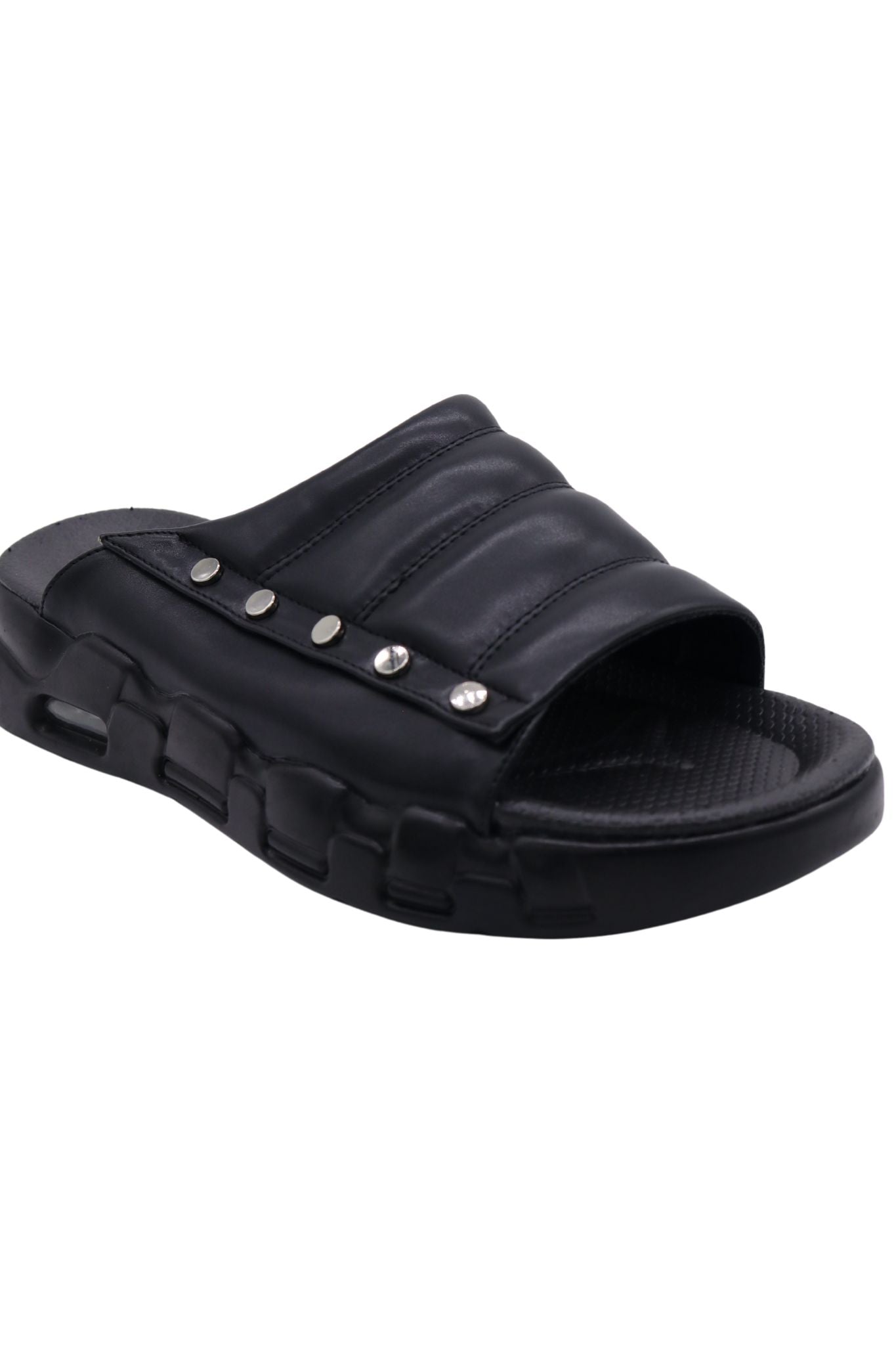 Sandalia ERAN | BLACK tipo slide con diseño acolchonado y aplicación de taches metálicos laterales. Ideal para quienes buscan confort sin perder estilo urbano.